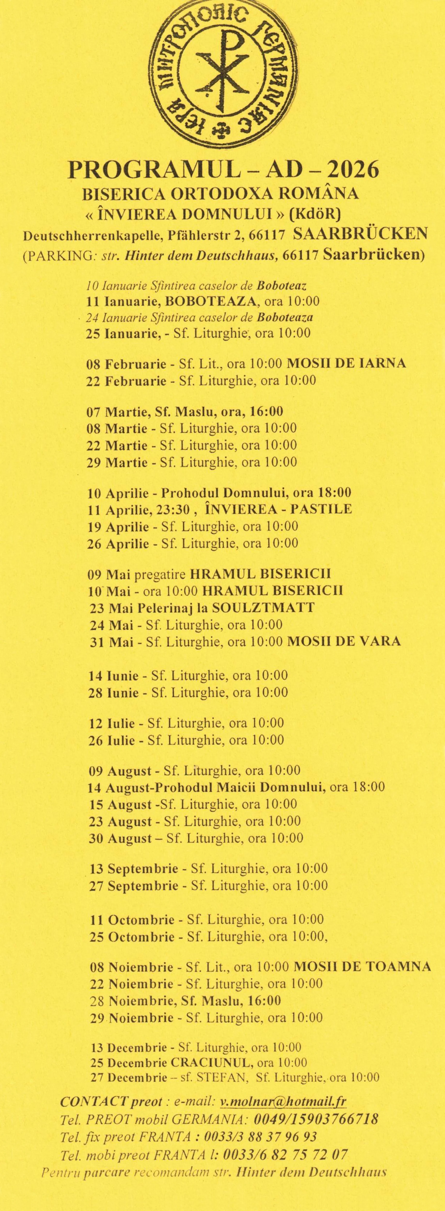 Preotul şi enoriaşii Parohiei Ortodoxe Române "Învierea Domnului" din Saarbrücken sunt invitaţi cu toată dragostea la această sărbătoare.